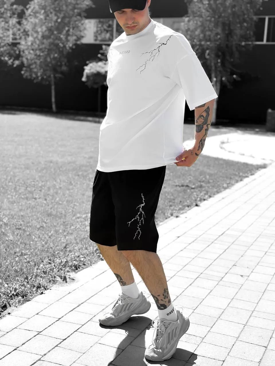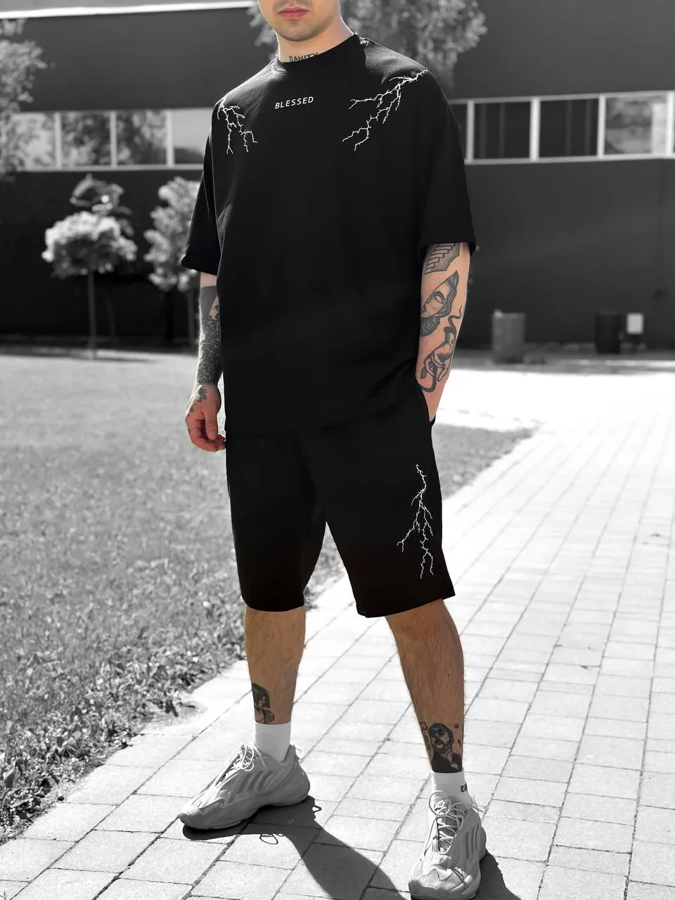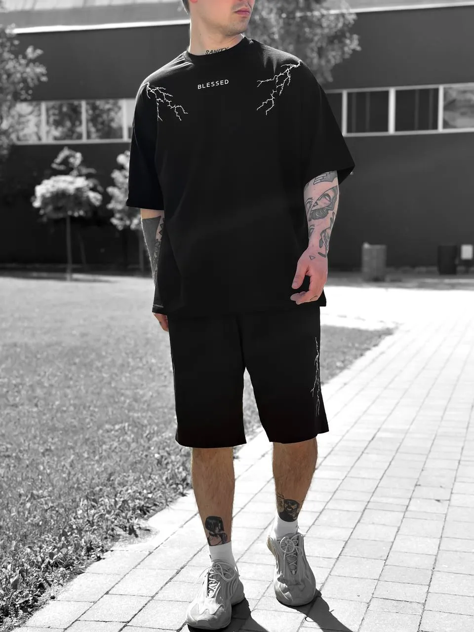 🖤 Комплект “BLESSED” Lightning Set — це влучне поєднання стрітстайлу, комфорту та унікального дизайну. Контрастна вишивка у вигляді блискавок на грудях і шортах додає образу динаміки, а напис BLESSED підкреслює впевненість і характер. Виготовлений в Україні з якісної двунитки та куліру, комплект ідеально підходить для повсякденного носіння, прогулянок, активного відпочинку або streetwear-фотосетів. Доступний у розмірах S, M, L, XL.