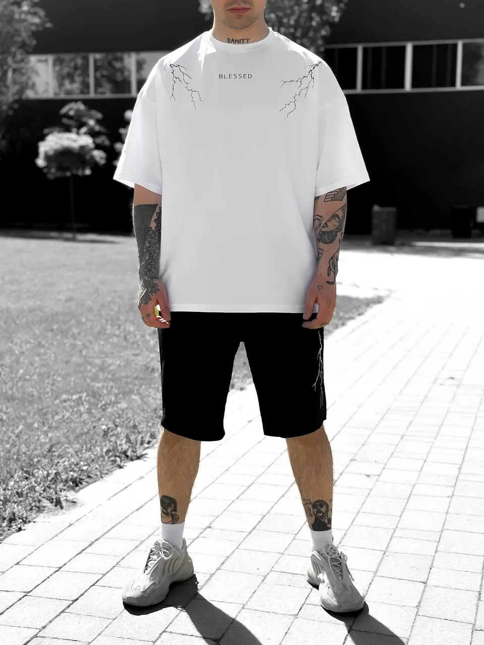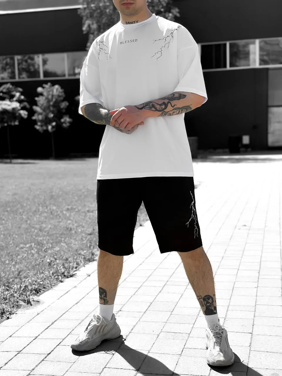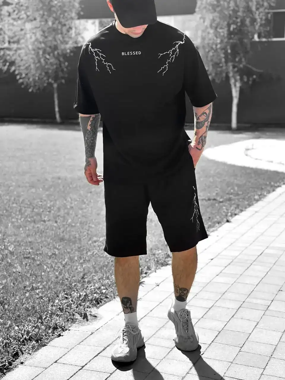 🖤 Комплект “BLESSED” Lightning Set — це влучне поєднання стрітстайлу, комфорту та унікального дизайну. Контрастна вишивка у вигляді блискавок на грудях і шортах додає образу динаміки, а напис BLESSED підкреслює впевненість і характер. Виготовлений в Україні з якісної двунитки та куліру, комплект ідеально підходить для повсякденного носіння, прогулянок, активного відпочинку або streetwear-фотосетів. Доступний у розмірах S, M, L, XL.