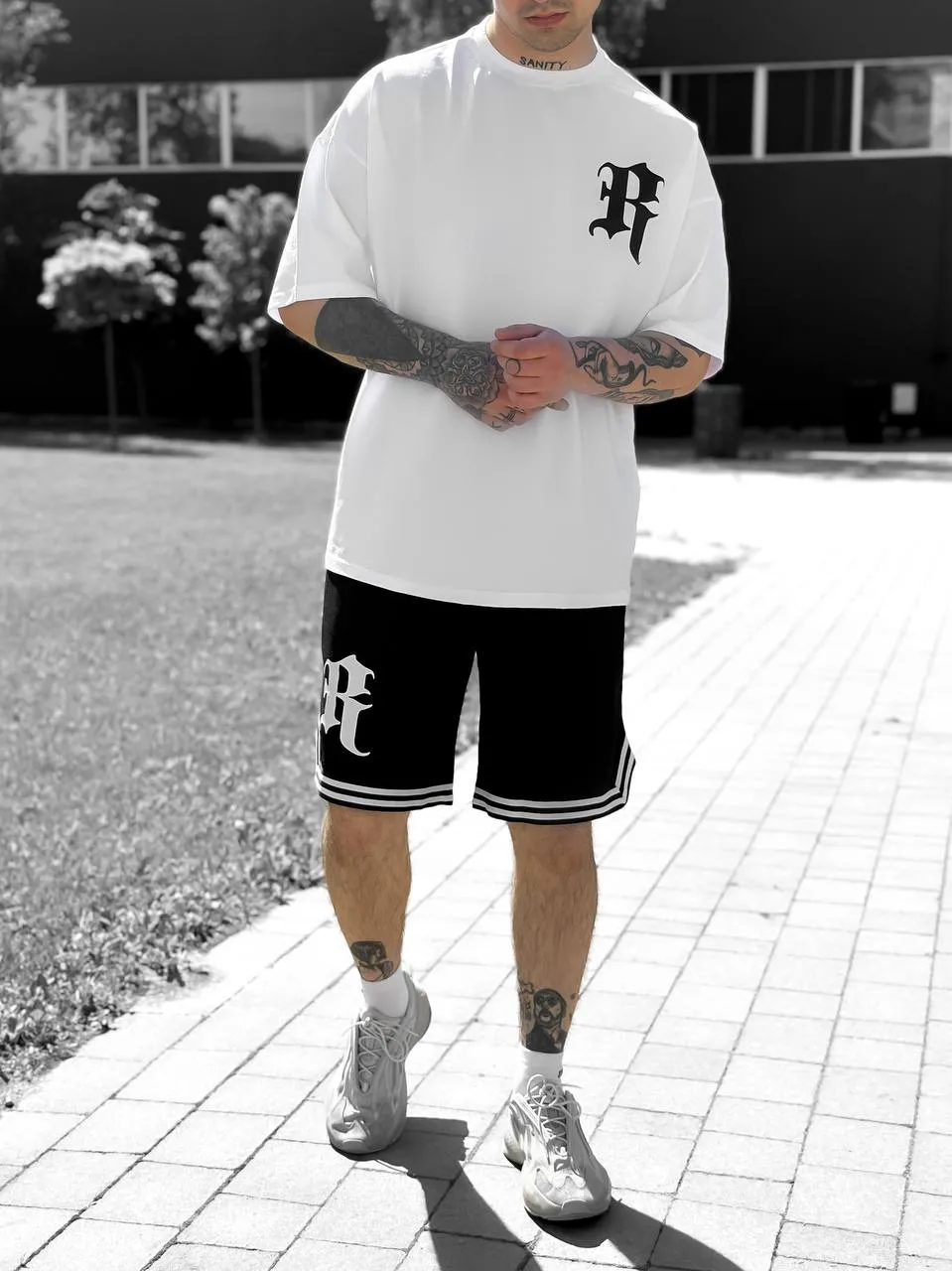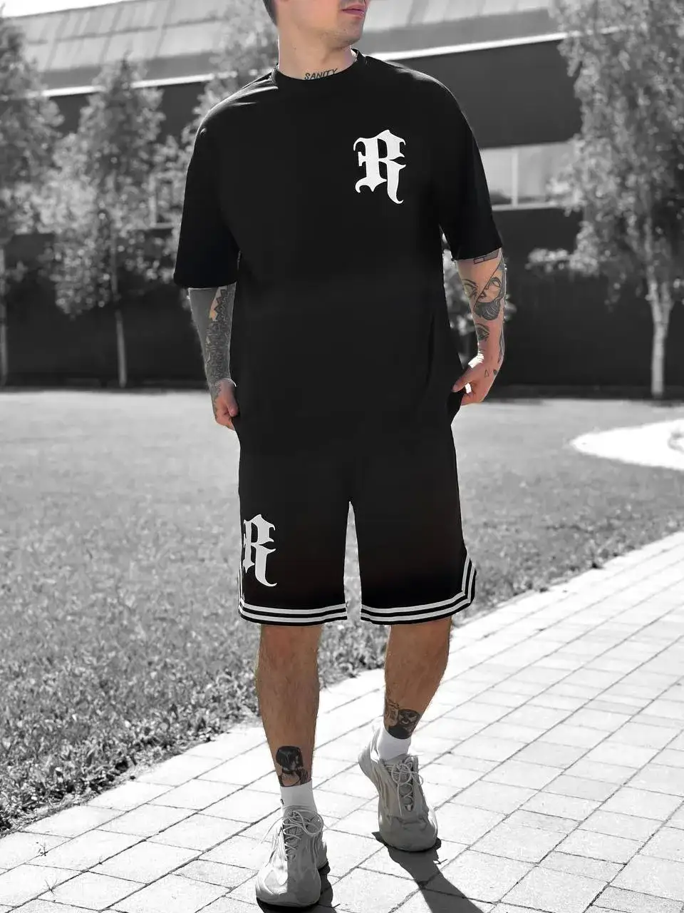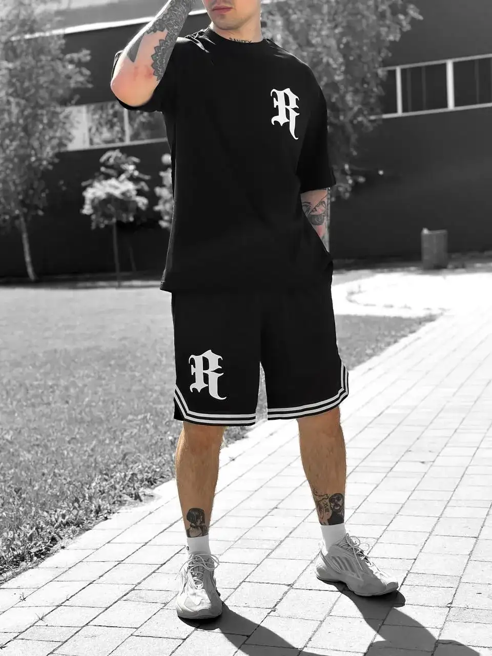 Костюм «Royal Code» — це футболка та шорти, які поєднують у собі сучасний вуличний стиль і натяк на класичну типографіку. Контрастний принт «R» додає особливого характеру, а двонитка та кулір забезпечують легкість і комфорт. Ідеальний вибір для тих, хто хоче виразити індивідуальність у повсякденному образі. Вироблено в Україні.